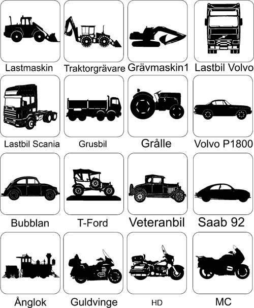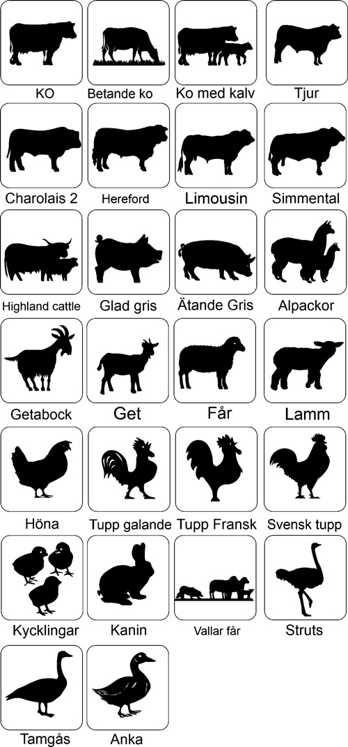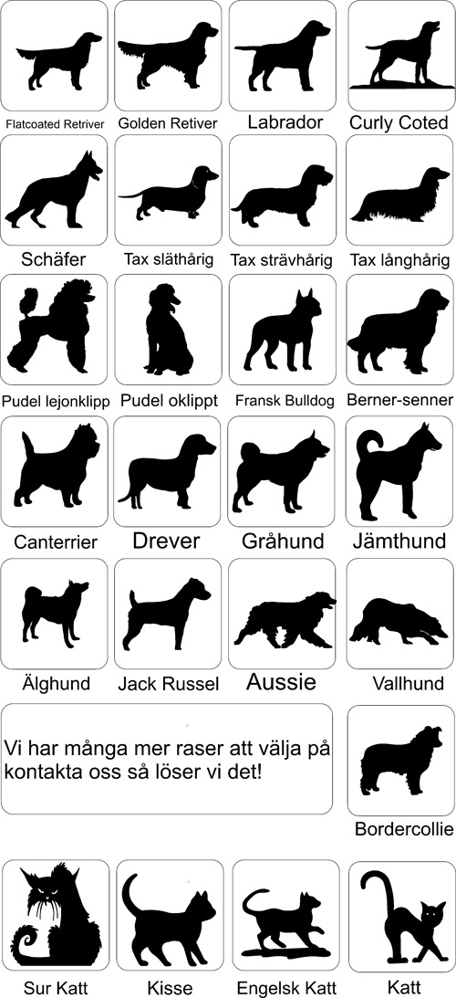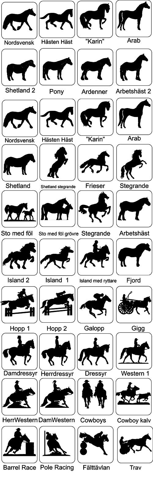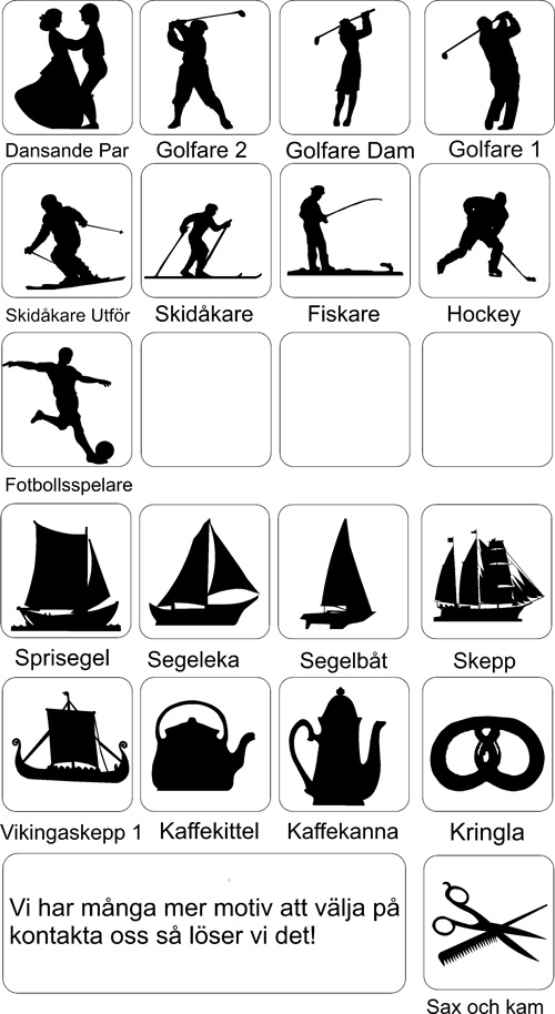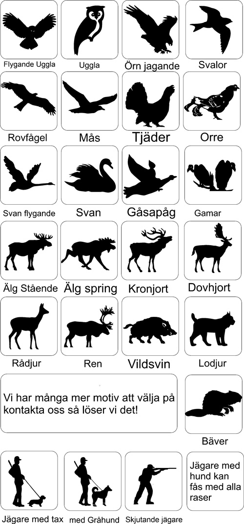 Här ser Du ett axplock av de många figurer vi har för att användas på skyltar och vindflöjlar och som väggdekorationer. Sammanlagt har vi nu i vårt sortiment mer än 300 figurer att välja mellan. Bla har vi många häst- och hundbilder. Vi gör även figurer efter kundens önskemål. Figurernas storlek anpassas till användningssättet. Vid beställning upprättar vi ett förslag som visar hur allt ser ut innan vi startar tillverkningen.